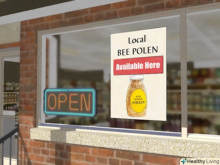 Дізнайтеся, де можна купити бджолиний пилок.місцевий бджолиний пилок можна купити в різних місцях. Місцевий бджолиний пилок можна купити в магазинах органічних продуктів або в магазинах товарів для здоров'я. Бджолиний пилок також можна знайти на громадських фермерських ринках. Якщо у вашій місцевості є ферми, які продають мед, можливо, тут вам вдасться купити і бджолиний пилок.[8]- Продавців, ринки або ферми, які продають бджолиний пилок, можна знайти в Інтернеті.