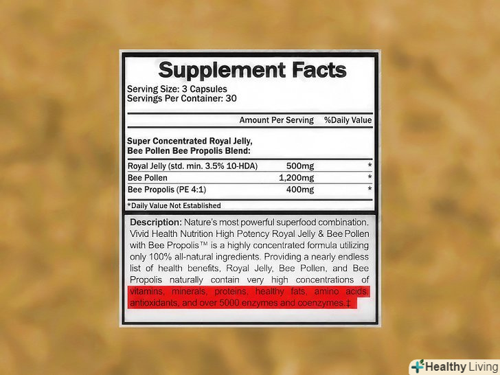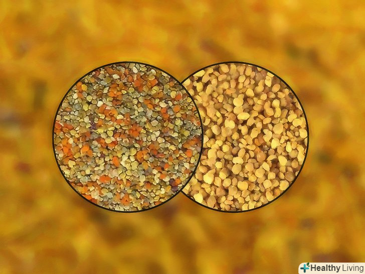 Виберіть правильний пилок. Існує безліч різних продуктів бджільництва. Одним з таких продуктів є бджолиний пилок. Бджолиний пилок-це крихітні гранули пилку, які збираються на бджолах під час польоту. У цьому пилку міститься слина бджоли.[3] бджолиний пилок продається в природному вигляді, а також у вигляді таблеток і капсул.- Бджолиний пилок в необробленому вигляді більш корисна. Ніколи не розігрівайте її, інакше вона втратить свої корисні ензими. Зачерпніть трохи гранул і прийміть їх так або посипте на їжу.