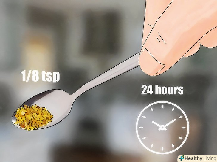 Прийміть пробну дозу.перед тим, як прийняти багато пилку, проковтніть пробну дозу, щоб зрозуміти, як ваш організм на неї відреагує. Почніть з 1/8 чайної ложки гранул (0,625 г). Зачекайте 24 години, щоб визначити наявність або відсутність побічної реакції.- Пробна доза також може становити одну гранулу пилку. Щодня повільно збільшуйте кількість пилку, щоб виміряти свою реакцію або переносимість.[9]