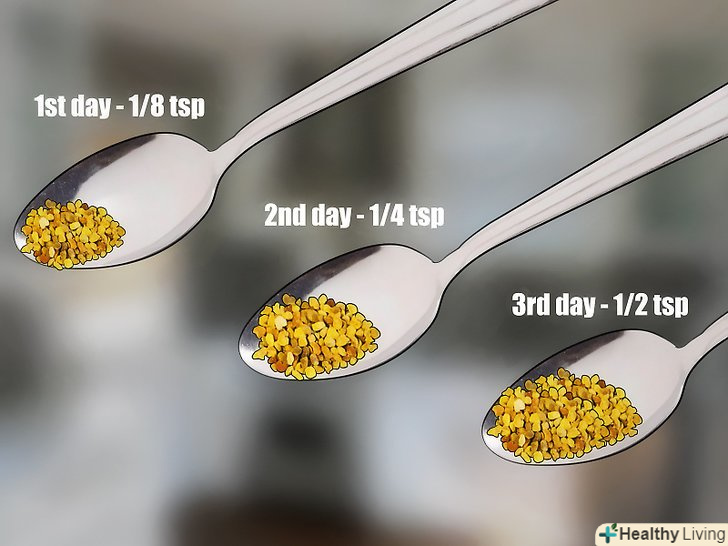 Поступово збільшуйте дозу бджолиного пилку.якщо через 24 години у вас так і не виникнуть побічні ефекти від прийому пилку, почніть поступово збільшувати її дозування. Щодня збільшуйте дозування на 1/8 чайної ложки (близько 0,625 г).- Як правило, дозування бджолиного пилку протягом сезону алергій становить 2,5-10 грама.[10]
