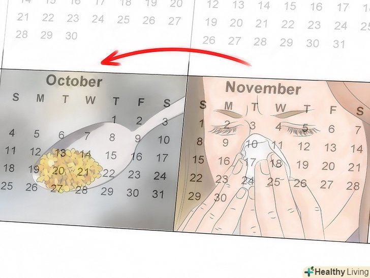 Почніть приймати пилок за місяць до сезону алергій.щоб отримати максимум користі від бджолиного пилку, почніть приймати її за місяць до того, як у вас зазвичай починається алергія. Потім продовжуйте приймати пилок протягом усього сезону алергій, щоб зменшити їх вплив.[11]- Щоб вгамувати осінню алергію, купіть бджолиний пилок, яка була зібрана восени. Якщо у вас весняна алергія, купіть пилок, зібрану навесні.