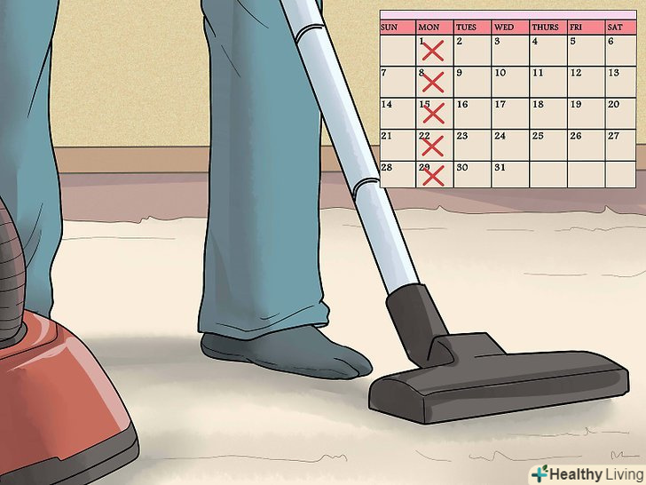 Пилососьте раз на тиждень.використовуйте пилосос з HEPA-фільтром, щоб очистити підлоги, килими та килими. Пилососи з HEPA-фільтром допомагають позбутися від алергенів і тим самим полегшити алергію. Подумайте також про чищення килимів та килимів парою, особливо якщо у вас є домашні тварини.[7]- Не забудьте зрушувати меблі, коли будете пилососити, щоб почистити у всіх місцях.