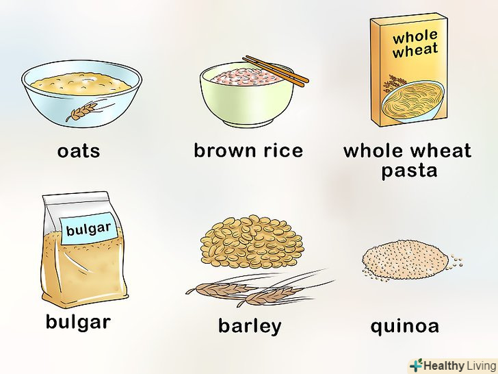 Вживайте не прості, а складні вуглеводи.можливо, ви вже помітили, що шматочок білого хліба стає солодким на смак, якщо трохи потримати його в роті. Це пояснюється тим, що в організмі вуглеводи переробляються в цукор. Вживання великої кількості простих вуглеводів, які містяться, наприклад, в білому хлібі, може привести до сплеску рівня глюкози в крові. Складні вуглеводи, наприклад продукти з цільних зерен, набагато довше розщеплюються в організмі. Вони є важливим джерелом енергії, тому намагайтеся уникати простих вуглеводів і вживайте складні в помірних кількостях.[23]- При діабеті другого типу можна вживати в помірних кількостях такі продукти зі складними вуглеводами, як вівсяні пластівці, коричневий рис, макарони з цільної пшениці, ячмінь, булгур, кіноа, білий картопля з шкіркою.