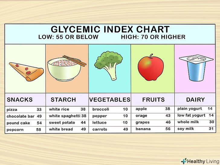 Використовуйте таблицю глікемічних індексів (ГІ) продуктів.щоб вибрати таку їжу, яка не викличе непотрібних сплесків рівня цукру в крові, ознайомтеся з глікемічними індексами тих продуктів, які ви збираєтеся вжити. ГІ показує кількість чистого цукру, який швидко виділяється в кровотік після того, як ви вживете той чи інший продукт. Глікемічні індекси багатьох продуктів можна знайти в Інтернеті. Знайдіть зведену таблицю або задайте в пошуковій системі назву цікавить Вас продукту і додайте слова «глікемічний індекс».[24]- Низьким вважається ГІ менше 55, середнім — 56-69, високим — більше 70. Проконсультуйтеся з лікарем або дієтологом щодо відповідного вам інтервалу ГІ.