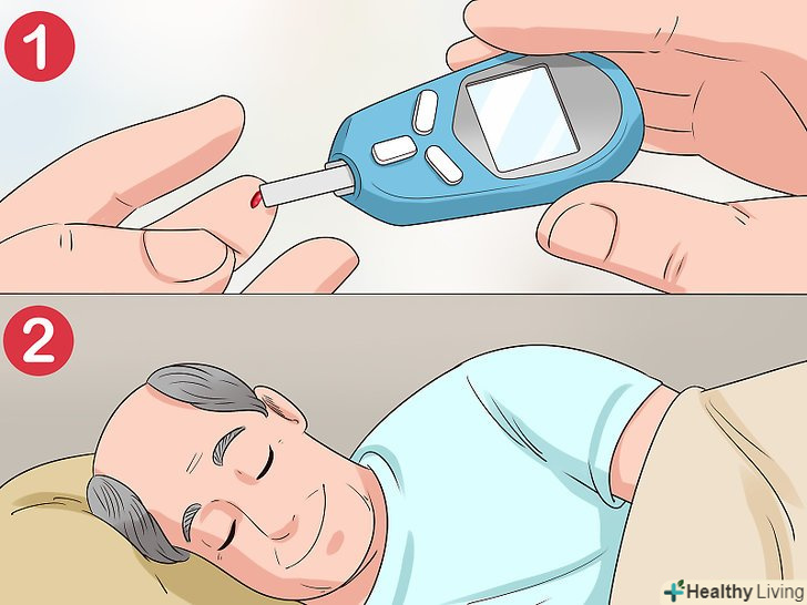 Не забувайте оцінювати і регулювати рівень цукру перед сном.необхідно знати рівень цукру в крові перед самим сном, щоб оцінити його протягом майбутньої ночі. Порадьтеся з лікарем щодо того, яким повинен бути рівень цукру в крові перед сном, і дізнайтеся, як можна безпечно регулювати його за допомогою інсуліну або легкої їжі.- Часто проблеми з рівнем цукру в крові виникають після голодування, наприклад після нічного сну. Тим не менш, є способи, які дозволяють регулювати рівень цукру з урахуванням таких періодів.