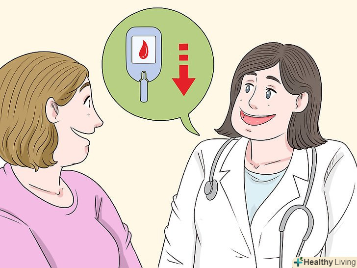 Поговоріть зі своїм лікарем про те, як справлятися з низьким рівнем цукру в крові.при цукровому діабеті існує ризик того, що рівень цукру в крові може стати занадто низьким (цей стан називається гіпоглікемією). У більшості людей гіпоглікемія виникає, коли вміст цукру опускається нижче 3,9 ммоль/л.при гіпоглікемії прийміть таблетку глюкози, випийте трохи фруктового соку або з'їжте цукерку. Після цього почекайте 15 хвилин і виміряйте рівень цукру в крові. Повторюйте до тих пір, поки вміст цукру не перевищить 3,9 ммоль/л, потім злегка перекусіть чимось корисним або поїжте.[7]- До поширених симптомів гіпоглікемії відносяться втома, дратівливість, тривога, нервове збудження, нерегулярне серцебиття, бліда шкіра, інтенсивне потовиділення і відчуття голоду.