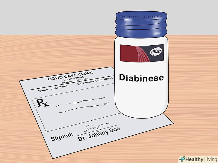 Приймайте призначені лікарем препарати.крім інсуліну вам можуть виписати інші ліки, які допоможуть підтримувати рівень глюкози в крові. Необхідно постійно приймати їх. Не пропускайте прийом ліків і проконсультуйтеся з лікарем, якщо у вас виникнуть будь-які проблеми. При діабеті другого типу часто призначають такі препарати:[9]- Ліки, які стимулюють вироблення інсуліну підшлунковою залозою, наприклад "Глібенкламід";[10]
