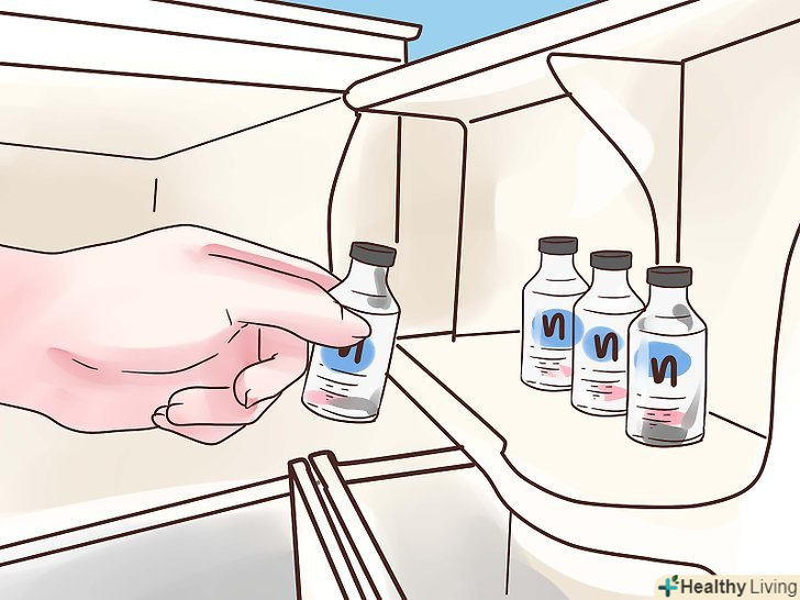 Зберігайте інсулін при відповідній температурі.всі інсулінові препарати слід тримати в холодильнику, але не в морозильній камері. Хоча компанії, що виробляють інсулін, роблять шприци-ручки, розраховані на кімнатну температуру, дослідження показали, що до першого застосування ці інструменти слід зберігати в холодильнику.[4]- Після першої ін'єкції шприц-ручку не слід тримати в холодильнику, його необхідно зберігати при кімнатній температурі, щоб інсулін не кристалізувався.