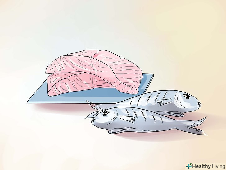 Регулярно їжте рибу.риба повинна стати однією з основних складових вашого раціону, оскільки в ній міститься велика кількість омега-3 жирних кислот. Особливо багаті цими кислотами лосось і тунець, їх м'ясо корисно і легко перетравлюється. Корисні і безпечні також більшість інших видів риби, наприклад скумбрія, оселедець, озерна форель, сардини.[1]- Хорошим джерелом омега-3 жирних кислот є також горіхи і насіння, особливо волоські горіхи і насіння льону. Додайте їх у свій раціон (наприклад, у складі салатів), щоб збільшити споживання омега-3 кислот. Крім того, риба дозволяє знизити споживання червоного м'яса, що допомагає зменшити кількість жирів і калорій.