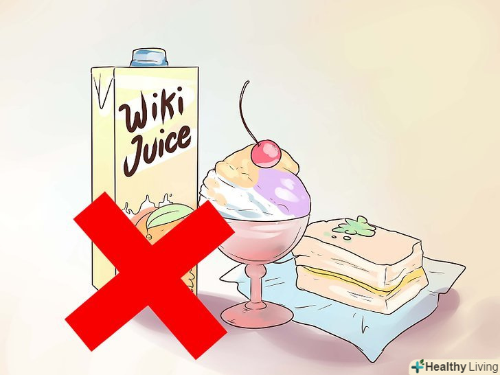 Вживайте якомога менше цукру.цукор входить до складу безлічі продуктів: фруктів, солодких напоїв, морозива, десертів, випічки. Віддавайте перевагу продуктам з штучними підсолоджувачами, такими як сахарин і сукралоза, оскільки вони надають їжі солодкий смак, але при цьому не постачають організм глюкозою і не викликають підвищення рівня цукру в крові.- У наш час випускаються різні замінники цукру, які легко можна додати в їжу і напої. Крім того, у продажу є безліч різноманітних продуктів, в яких замість цукру використані його штучні замінники. При виборі продуктів в магазині вивчайте етикетки, на яких вказано їх склад.