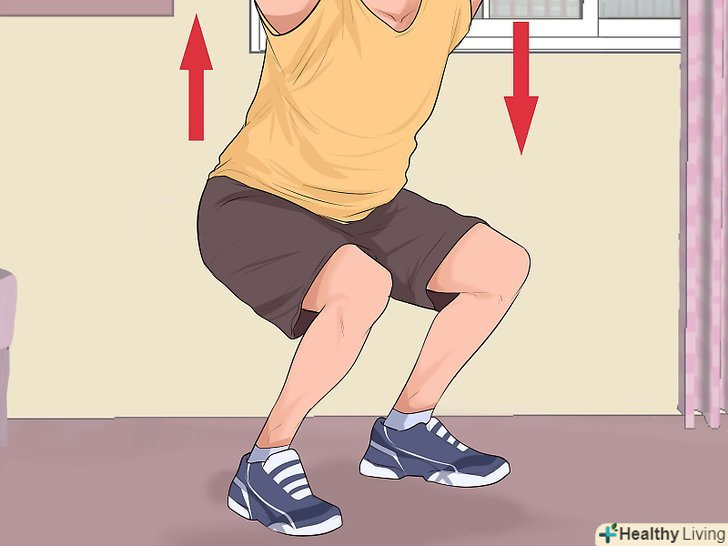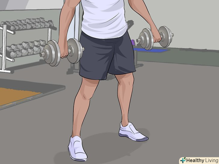 - Випади. Ця вправа тренує сухожилля підколінної ямки. Для його виконання необхідно взяти в руки гантелі. Встаньте прямо, поставте ноги на ширині плечей, руки опустіть з боків. Зробіть великий крок вперед однією ногою, а потім виведіть вперед і другу ногу, щоб ви знову опинилися в положенні стоячи ноги на ширині плечей. Для більш детального опису техніки виконання випадів прочитайте додаткову інформацію.[15]