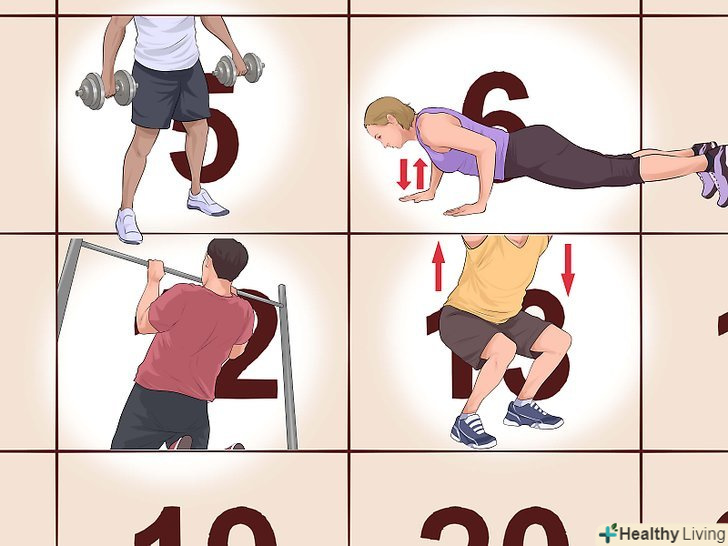 Варіюйте виконувані вправи.виконання під час тренувань протягом декількох тижнів одних і тих же вправ викличе звикання м'язів, через що вони припинять нарощувати м'язову масу. Це так звана стадія стабілізації. Замість цього під час тренування виконуйте тільки один-два види запропонованих вправ для кожної групи м'язів. Через кілька тижнів міняйте використовувані види вправ. Змушуючи м'язи кожен раз пристосовуватися заново, ви зможете витягти максимум зі своїх тренувань.[17]