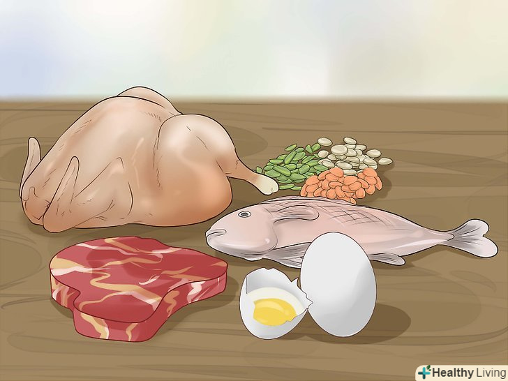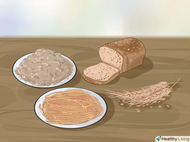 Отримуйте вуглеводи з цільнозернових пшеничних продуктів.вам необхідні вуглеводи в дієті, так як без них на енергетичні витрати вашого організму буде витрачатися білок. Через це м'язам стане бракувати білка, і вони не зможуть рости. Вуглеводи в продуктах з вибіленої борошна вищого сорту, наприклад, в булках, мають високий глікемічний індекс і призводять до підвищення рівня цукру в крові. Однак цільнозернові продукти є джерелом не збагачених вуглеводів. Їжте цільнозерновий хліб, макарони і пластівці, щоб забезпечити себе необхідною дозою вуглеводів.[31]