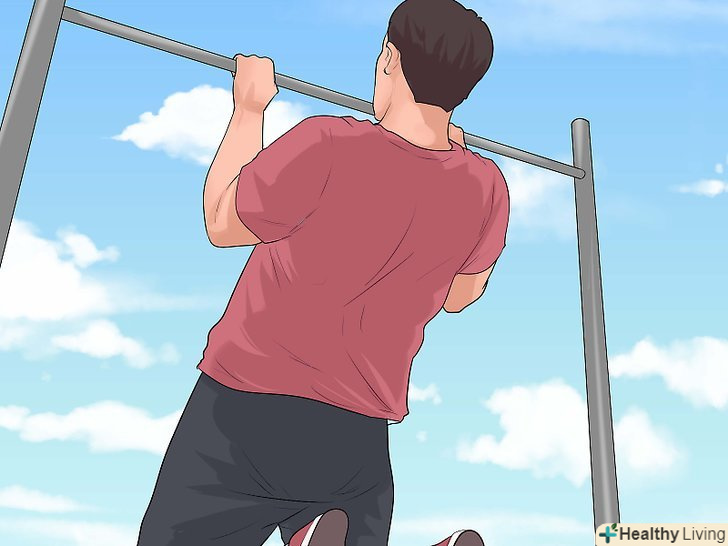 Прокачуйте спину.незважаючи на те, що новачки нерідко виключають спину зі своїх тренувань, її прокачування дуже важливо для збалансованого розвитку верхньої частини тіла. На спині є великі групи м'язів, які можна зміцнити і привести в тонус поруч непоганих вправ.[11]- Підтягування. Це проста вправа можна виконувати на перекладині без жодного додаткового обладнання. Воно зміцнює м'язи верхньої і середньої частини спини. Візьміться за поперечину, розвівши руки приблизно до ширини плечей, а потім підтягніть себе, щоб підборіддя виявився безпосередньо над поперечиною. Для прокачування саме спини стежте за тим, щоб під час підтягування лопатки були зведені між собою. В якості додаткового бонусу підтягування також зміцнюють біцепси. Для більш детального опису техніки виконання підтягувань ознайомтеся з додатковою інформацією.