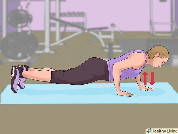 Прокачуйте груди.у грудях є великі і малі грудні м'язи. І це досить великі м'язи, які при правильних тренуваннях здатні внести свій внесок в нарощування м'язової маси. Для збільшення розміру і сили грудних м'язів спробуйте виконувати нижчезазначені вправи.[12]- Віджимання. Для даної вправи вам не знадобиться додаткове обладнання, крім підлоги. При цьому буде прокачуватися груди і трицепси. Для детального опису правильної техніки виконання віджимань і ознайомлення з різними видами віджимань прочитайтедодаткову інформацію. Крім того, віджимання є хорошим способом розігріву перед роботою з важкими вагами.