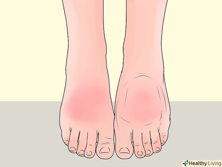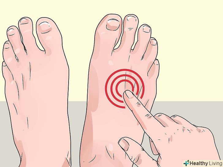 Зверніть увагу на відчуття печіння і поколювання.ще один характерний симптом-це неприємне відчуття поколювання, мурашок по шкірі, а також печіння.[3] Все це схоже на відчуття, які виникають в ступні при відновленні кровообігу, якщо ви «відсиділи» ногу. Ці неприємні відчуття, які називаються парастезией, варіюються від легких до вельми серйозних і зазвичай проявляються по-різному в правій і лівій стопах.- Поколювання і печіння зазвичай виникають в нижній частині стопи (підошві), а пізніше процес може поширитися на вищерозміщені області стоп.