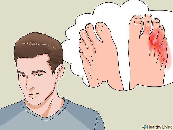 Будьте вкрай уважні щодо будь-яких ознак пошкодження або інфекції стопи.якщо не брати до уваги переломи кісток при падінні під час ходьби, травми стопи є найчастішим ускладненням, з яким стикаються хворі на діабет.[7] через зниження чутливості хворі на діабет часто не помічають незначні пошкодження шкіри стоп, такі як садна, неглибокі порізи, мозолі і укуси комах. З цієї причини такі незначні травми можуть запалитися, що, в свою чергу, потенційно небезпечно з точки зору поширення інфекції в навколишні тканини. У серйозних випадках це може закінчитися ампутацією пальця або навіть всієї стопи.- Візуальні ознаки інфекції включають в себе набряк тканин, зміна кольору (шкіра набуває синюватого або червонуватого відтінку), і виділення білуватого гною або іншої рідини з рани.