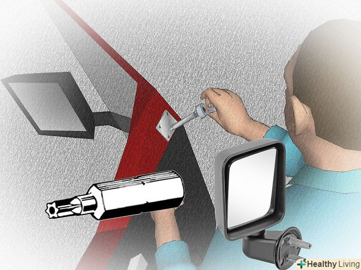 Зніміть дзеркала з дверей.Бічні дзеркала встановлені на дверях у більшості моделей Jeep. Вам будуть потрібні дзеркала з розбірним корпусом, щоб зняти їх з дверей і встановити на автомобіль.- За допомогою зіркоподібної насадки T40 відкрутіть дві кришки під вітровим склом, розташовані поруч з тим місцем, де були закріплені дзеркала заднього виду.