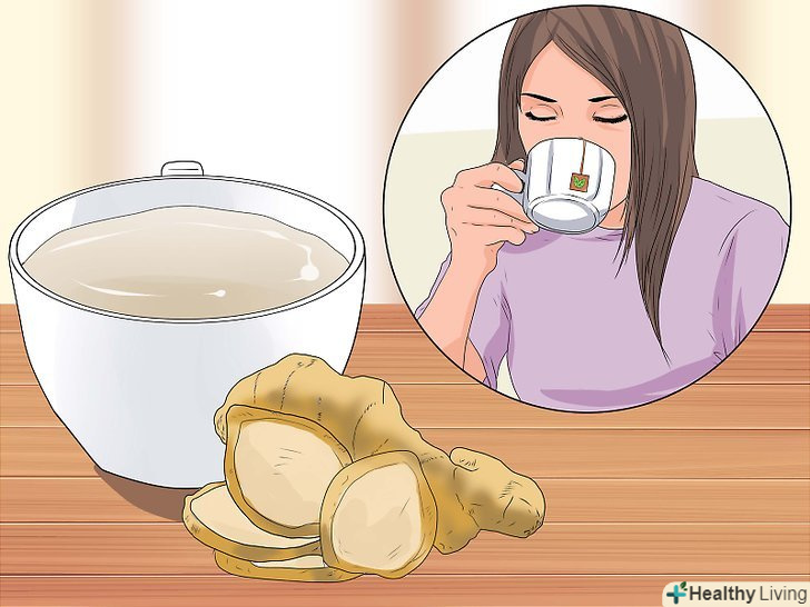 - Приготуйте імбирний чай або відвар. Існує безліч рецептів, але найбільш простий з них полягає в тому, щоб розтерти на тертці приблизно 100 грамів (один досить великий відросток) свіжого кореня імбиру. Після цього засипте ½ чайної ложки розтертого імбиру в 200-250 мілілітрів гарячої води. Дайте розчину настоятися протягом 5-10 хвилин. При бажанні можна додати трохи меду. Злегка підсолоджені напої допомагають впоратися з розладом шлунка.[26]
