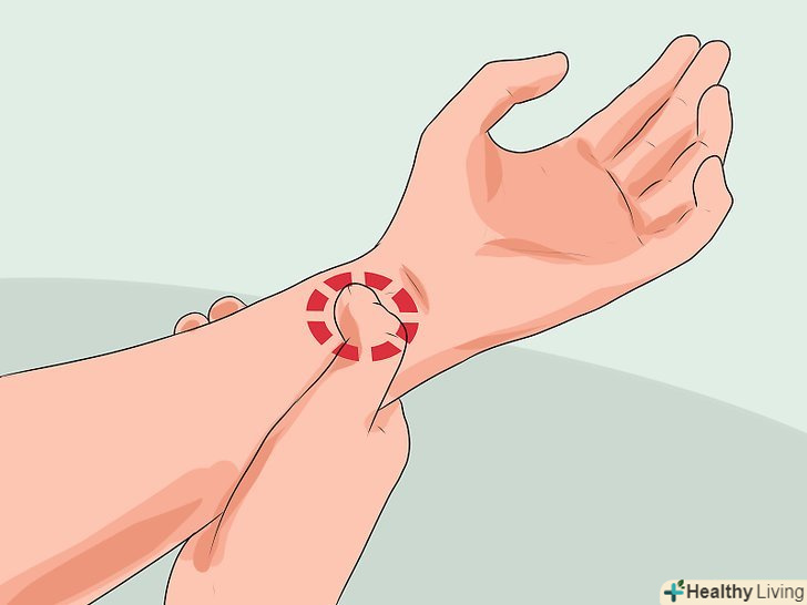 Спробуйте акупресуру. На відміну від аку пунктури, для якої потрібне використання голок і професійне навчання, легку аку прессуру можна провести в домашніх умовах. Стимуляція акупунктурної точки P6, розташованої на внутрішній стороні передпліччя, здатна запобігти нудоту і блювоту. При стимуляції цієї точки в спинний і головний мозок надходять сигнали, які ініціюють виділення в кров речовин, що знижують нудоту і блювоту.[29]- Визначте місцезнаходження точки P6, відомої також як точка "ней-гуань". Простягніть руку долонею вгору, розслабивши пальці.[30]
