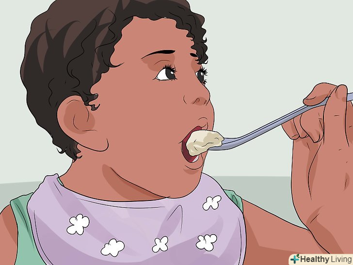 Запропонуйте дитині невелику кількість їжі.не давайте тверду їжу протягом перших 24 годин після початку блювоти.[37] як тільки блювота припиниться, дайте дитині розм'якшену їжу, наприклад, желе, картопляне пюре, бульйон, рис, банани.[38] не наполягайте на прийомі їжі, якщо дитина не хоче їсти.- Уникайте продуктів з високим вмістом клітковини і цукру.[39]