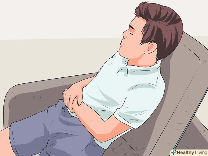 Сядьте або приляжте, спираючись об що-небудь.можна присісти на диван, відкинувшись на подушки. Якщо рухатися або лежати на плоскій поверхні, ваш стан може тільки погіршитися.[2]- Якщо ви прикуті до ліжка, ляжте на бік, щоб не задихнутися блювотними масами.[3]
