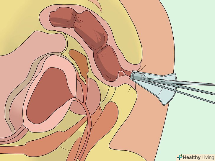 Зробіть лігування гумовими кільцями в разі внутрішнього геморою.лікар введе зонд за допомогою аноскопа (пластикового інструменту, який вставляється в задній прохід для огляду прямої кишки) і прикріпить до основи гемороїдального вузла гумовий пристрій. Цей пристрій перекриє кровообіг і призведе до утворення рубців на гемороїдальному вузлі. Згодом рубці стиснуться і усунуть геморой.[16]- Після процедури можливий дискомфорт. Його можна полегшити за допомогою сидячих ванн, теплих вологих компресів і/або мазей.