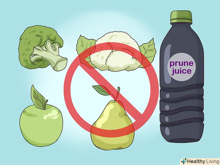 Уникайте квасолі, овочів і фруктів, які викликають газоутворення.квасоля та деякі інші овочі та фрукти містять важко перетравлювані вуглеводи. Не їжте або постарайтеся обмежити споживання брокколі, цвітної, городньої і брюссельської капусти, яблук, груш, чорносливу і соку з нього.[5]- Фрукти та овочі є важливою частиною здорового раціону, тому не відмовляйтеся від них повністю. Просто вибирайте такі овочі і фрукти, які легше перетравлюються, наприклад салат-латук, помідори, авокадо, ягоди і виноград.