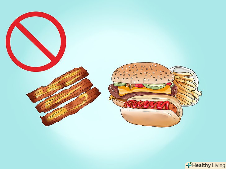 Постарайтеся їсти менше жирної їжі.уникайте жирних продуктів, які можуть уповільнювати травлення і викликати скупчення газів в кишечнику. До таких продуктів відносяться жирне червоне м'ясо, перероблені м'ясні продукти (наприклад, бекон), Смажена їжа. Замініть їх менш жирними і легше перетравлюються продуктами, такими як м'ясо птиці, морепродукти, яєчні білки, легко засвоювані овочі і фрукти.[6]