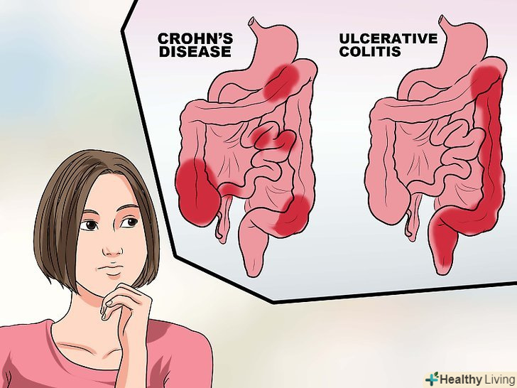 Дізнайтеся більше про IBD.оскільки поняття" запальні захворювання кишечника " служить загальним терміном для позначення хвороби Крона і виразкового коліту, необхідно розуміти різницю між цими досить схожими захворюваннями. Це допоможе вам краще розпізнати симптоми і вчасно почати лікування.[55]- Хвороба Крона являє собою хронічне запалення шлунково-кишкового тракту. На відміну від виразкового коліту, хвороба Крона вражає головним чином закінчення тонкої, або клубової кишки, а також початок товстої кишки, хоча вона може виникнути і в будь-якому іншому місці шлунково-кишкового тракту, від порожнини рота до заднього проходу.[56]