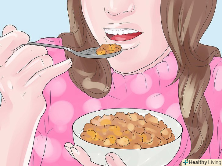 Починайте їсти прісну їжу.як тільки ви відчуваєте, що вже можете, вам потрібно починати їсти. Зазвичай після блювоти має пройти близько 4 годин. Коли вам вдалося попити води, посмоктати льоду, вжити рідини крім води, можете спробувати з'їсти що-небудь просте і легке для шлунка. Є слід тільки в тому випадку, якщо вас не рвало вже хоча б 4 години. Крекери і сухе печиво — хороший вибір. Крім них можна спробувати щось з наступних продуктів:[3]:- Банани, рис, яблучне пюре, тости без нічого і солоні крекери. Можете запам'ятати цей набір щадних для шлунка продуктів за допомогою абревіатури БРЯТС.