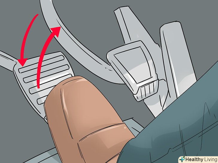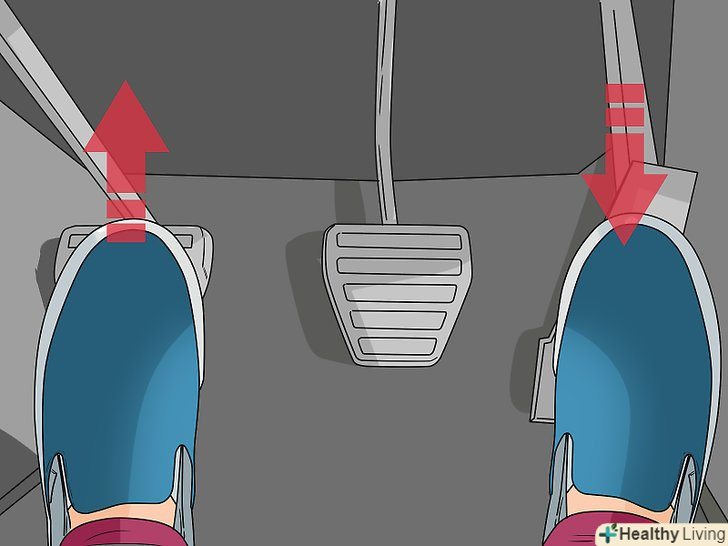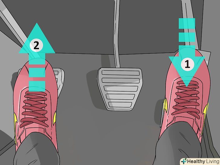 Щоб автомобіль почав рух, трохи підніміть ногу зі зчеплення, поки не відчуєте невелике зниження оборотів двигуна.одночасно правою ногою злегка натисніть на газ. Знайдіть баланс тиску на газ і зменшення тиску на зчеплення. Швидше за все, вам доведеться зробити це кілька разів, поки ви знайдете відповідну комбінацію.[9]- Можна також відпустити зчеплення до моменту зниження оборотів двигуна і лише потім натиснути на газ. У цей момент автомобіль почне рух. У двигуна повинно бути достатньо оборотів, щоб машина не заглохла під час відпускання педалі зчеплення. Можливо, на початку вам буде важкувато, так як необхідно звикнути, що у машини три педалі. Будьте готові в будь-який момент підняти ручне гальмо і зупинитися, поки ви не навчитеся керувати автомобілем.