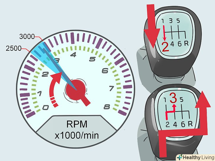 Визначте, коли пора перемикатися на більш високу передачу.коли під час руху кількість обертів двигуна досягає 2500-3000, пора перейти на наступну передачу – наприклад, другу, якщо ви їхали на першій. Цей показник приблизний, так як залежить від типу вашого автомобіля. Двигун почне працювати голосніше і швидше, і ви повинні навчитися розпізнавати цей звук.[11]- Натисніть педаль зчеплення і переведіть важіль перемикання швидкостей в нижнє ліве положення (в більшості автомобілів тут знаходиться друга передача).