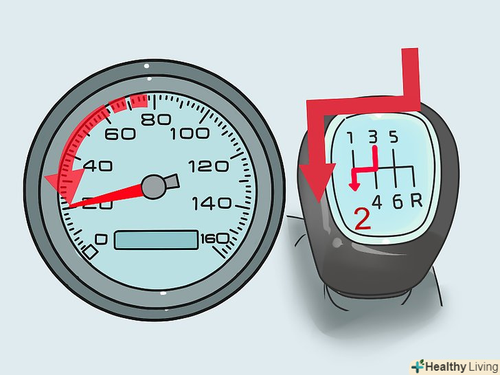 Знижуючи швидкість, перейдіть на більш низьку передачу.якщо ви їдете занадто повільно для поточної передачі, машина почне вібрувати, як ніби збирається стихнути. Щоб переключитися на нижчу передачу під час руху, дійте так само, як і при переході на більш високу: натисніть зчеплення, відпустіть газ, переключіть важіль (скажімо, з третьої передачі на другу) і відпустіть зчеплення, одночасно натиснувши на газ.[13]