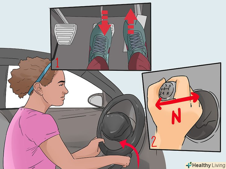 Будьте готові до того, що під час навчання двигун неодноразово буде глухнути.якщо ви відпустите педаль зчеплення занадто швидко автомобіль затихне. Якщо двигун звучить як ніби зараз затихне, утримуйте зчеплення в тому ж положенні або навіть злегка натисніть на нього. Якщо він все ж заглох, вичавіть зчеплення, загальмуйте, переключіть важіль на нейтральну передачу і знову запустіть двигун. Не панікуйте![10]- Високі обороти двигуна при педалі зчеплення в проміжному положенні (не повністю вичавленої, але і не відпущеної) зчеплення викликають прокручування або задимлення деталей зчеплення. Цього слід уникати.