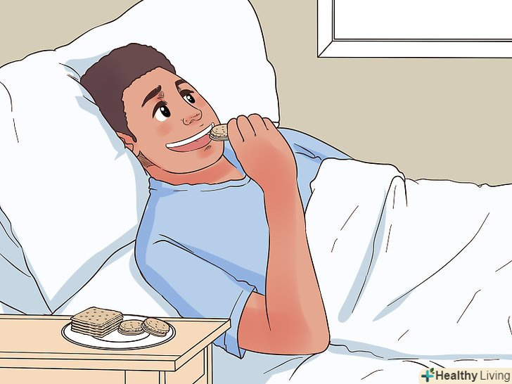 Щоб впоратися з ранковою нудотою, з'їжте кілька крекерів, перш ніж вставати з ліжка.якщо ви часто відчуваєте нудоту після пробудження, тримайте на нічній тумбочці пакет звичайних крекерів. Іноді корисно з'їсти відразу ж по пробудженні що-небудь просте і нехитре — це допомагає підняти рівень цукру в крові і вгамувати нудоту.[17]- Даний метод прекрасно підходить вагітним жінкам, які відчувають нудоту вранці, і тим, хто проходить лікування хіміотерапією.
