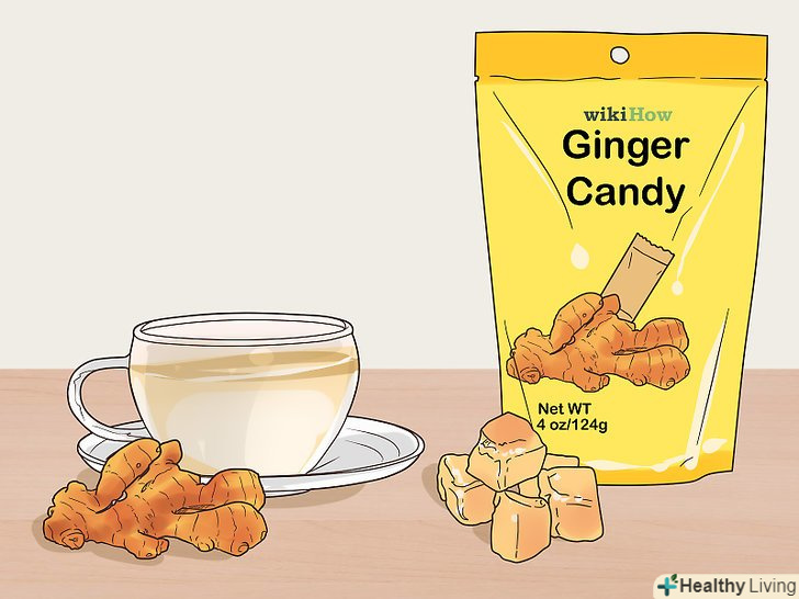 Спробуйте заспокоїти шлунок за допомогою імбиру.попийте імбирний чай або посмокчіть натуральні імбирні льодяники. Імбир містить речовини, які нормалізують травлення і полегшують нудоту.[3]- Можна очистити і нарізати шматочок імбирного кореня довжиною близько 5 сантиметрів і залити його 1 склянкою (250 мілілітрах) окропу. Після того як чай настоїться, процідіть його або пожуйте шматочки імбиру, коли вони охолонуть.