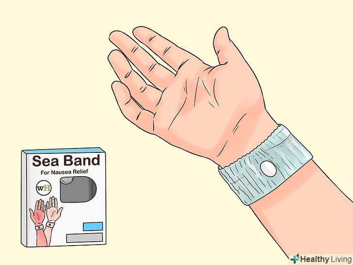 Носіть на зап'ястях акупресурні браслети.стимулюйте особливу акупресурну точку P6, яка допомагає вгамувати нудоту, за допомогою спеціальних акупресурних браслетів. Такі браслети не мають відомих побічних ефектів, і, якщо вони допомагають вам, їх можна носити протягом усього дня.[26]- Можна масажувати дану точку і без браслетів: просто натисніть на внутрішню сторону зап'ястя приблизно в 2 пальцях нижче основи великого пальця.