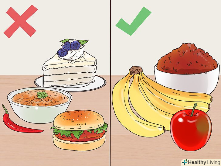 Віддавайте перевагу легкої для шлунка їжі.уникайте занадто солодкої, гострої і жирної їжі, так як вона може викликати нудоту. До легко перетравлюються продуктів, які допомагають при нудоті, відносяться банани, рис, яблука і тости.[8]
