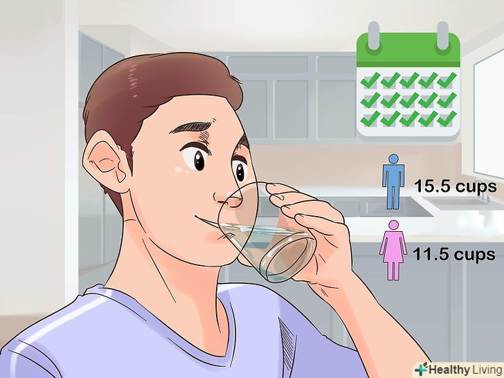 Пийте рекомендовану кількість рідини, щоб підтримувати водний баланс.чоловікам рекомендується щодня випивати 15 склянок (3,7 літра), а жінкам — 11 склянок (2,7 літра) рідини.[14] нестача рідини може посилити нудоту, а повторювана блювота, в свою чергу, призводить до зневоднення.[15]- Підтримка водного балансу організму особливо важливо при сильній блювоті або діареї.