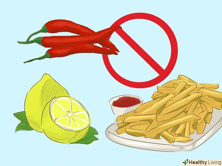 Утримуйтеся від гострих, жирних і кислих продуктів, які дратують слизову оболонку шлунка.гострі приправи і спеції стимулюють вироблення шлункового соку і можуть дратувати шлунок. Тим же ефектом володіє і жирна, смажена і кисла їжа. Згодом вживання подібної їжі може привести до гострого гастриту.[13] утримуйтеся від наступних продуктів:- Перець халапеньо і хабанеро (в тому числі в складі гострих соусів);