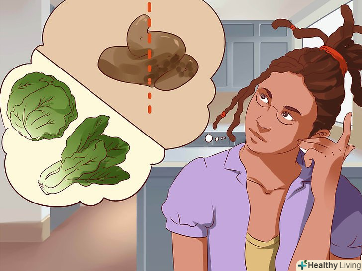 Зверніть увагу, що деякі продукти можуть викликати зміну кольору стільця.харчові барвники, листові овочі і навіть буряк можуть впливати на колір стільця. У цьому немає нічого страшного. Наприклад, зелені листові овочі, такі як капуста або шпинат, можуть зробити ваш стілець зеленим, а буряк, наприклад, може додати червонуватий відтінок. Це не є причиною для занепокоєння, особливо якщо ви недавно їли ці продукти.[4]- Лише в рідкісних випадках кал червоного кольору може бути показником серйозних проблем з кишечником. Причини крові в стільці різні, починаючи від нешкідливих, наприклад, роздратування шлунково-кишкового тракту або геморою.