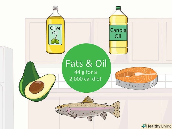 Вживайте корисні жири і рослинні масла в помірних кількостях.Омега-3 жирні кислоти і ненасичені жири корисніше, ніж гідрогенізовані масла і транс-жири. Корисні жири містяться в м'ясі лосося і форелі, авокадо, рослинних оліях (наприклад, в оливковій і соняшниковій олії). На частку жирів і масел має припадати близько 20% щоденної кількості споживаних калорій, що при добовій нормі 2000 калорій становить приблизно 44 грами.[17]- Корисні жири необхідні організму, і повна відмова від жирів всіх видів може навіть підвищити ризик утворення жовчних каменів.