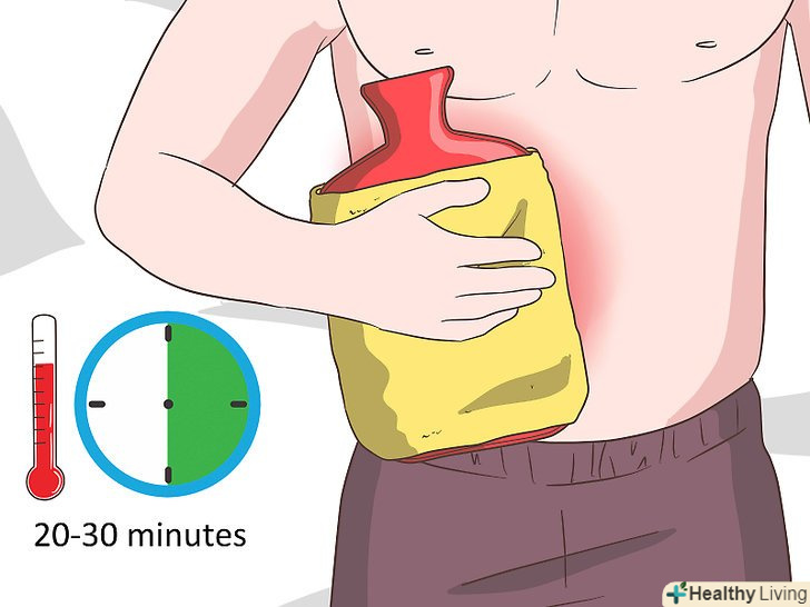 Прикладайте до хворого місцяТеплі компреси.щоб швидко полегшити біль, загорніть в тканину пляшку з гарячою водою, грілку або покупної теплий компрес. Прикладіть компрес до верхньої правої частини живота і тримайте його там 20-30 хвилин.[3]- Встаньте і спробуйте пройтися після того, як знімете теплий компрес. Коли болі загострюються, прикладайте компрес раз в 2-3 години.