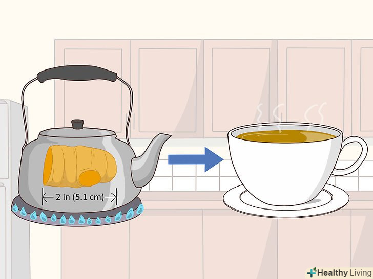 Заваріть чай з куркуми.Візьміть корінь куркуми довжиною близько 5 сантиметрів, наріжте його тонкими шматочками і заваріть в каструлі з киплячою водою. Можна також щодня приймати таблетку з 1000-2500 міліграмами куркуми. Крім іншого, куркуму використовують для лікування хвороб жовчного міхура.[5]- Зазвичай куркума безпечна, але все ж слід проконсультуватися з лікарем, перш ніж пити її відвар або приймати харчові добавки у вигляді таблеток.