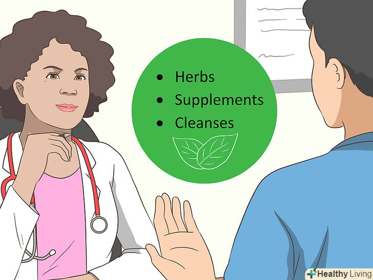 Перш ніж приймати рослинні препарати, харчові добавки або очищаючі засоби, проконсультуйтеся з лікарем.є безліч домашніх засобів, які, як вважають, допомагають при болю в жовчному міхурі, проте позитивна дія більшості з них не має наукового підтвердження. Більш того, деякі трави і харчові добавки можуть посилити проблеми з жовчним міхуром і інші захворювання, а також взаємодіяти з прийнятими медикаментами.[7]- Розторопша, перцева м'ята, цикорій і деякі інші трави допомагають полегшити біль в жовчному міхурі. Однак вони можуть викликати закупорку жовчних проток і інші ускладнення.
