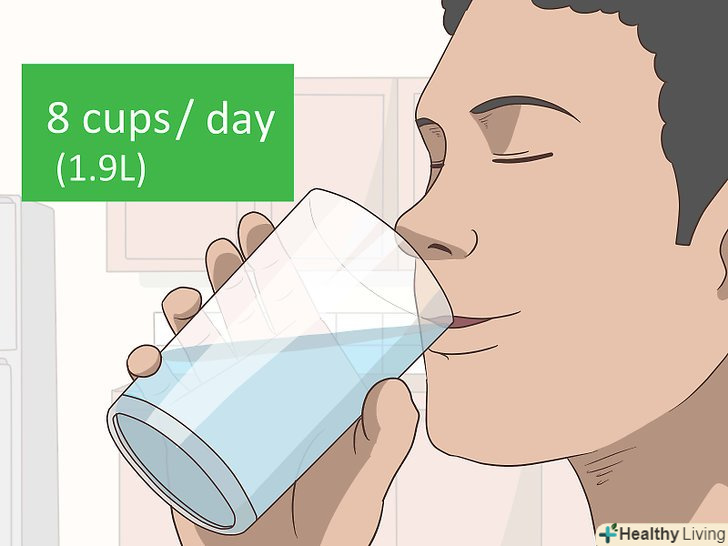 Випивайте щонайменше 8 склянок (2 літри) води в день.вода необхідна для загального здоров'я, вона допомагає розчиняти камені і тверді відкладення в жовчному міхурі. Це особливо важливо в тому випадку, якщо проблеми з жовчним міхуром супроводжуються діареєю, так як вона зневоднює організм.[12]- Хоча зазвичай рекомендується випивати 8 склянок (2 літри) води в день, вам може знадобитися більше в жарку погоду або при заняттях спортом. Якщо ви багато потієте або займаєтеся фізичними вправами в жарку погоду, намагайтеся пити по 0,5–1 літру на годину.