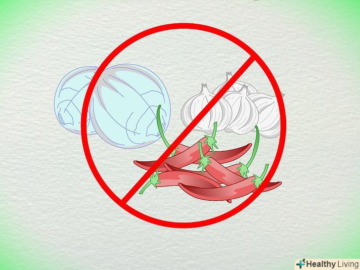 Виключіть зі свого раціону занадто гостру їжу, часник і цибулю.ці продукти викликають неприємний запах з рота незалежно від того, скільки разів ви чистите зуби. Справа в тому, що при перетравленні такої їжі утворюються речовини, що володіють сильним запахом. Ці сполуки всмоктуються в кров, а кров пізніше надходить до легких, після чого ці сильно пахнуть речовини виділяються назовні з нашим диханням.[8]- Якщо ви не можете виключити ці продукти зі свого раціону, після прийому їжі жуйте жувальну гумку без цукру або беріть з собою маленьку упаковку ополіскувача для порожнини рота і користуйтеся ним після їжі.