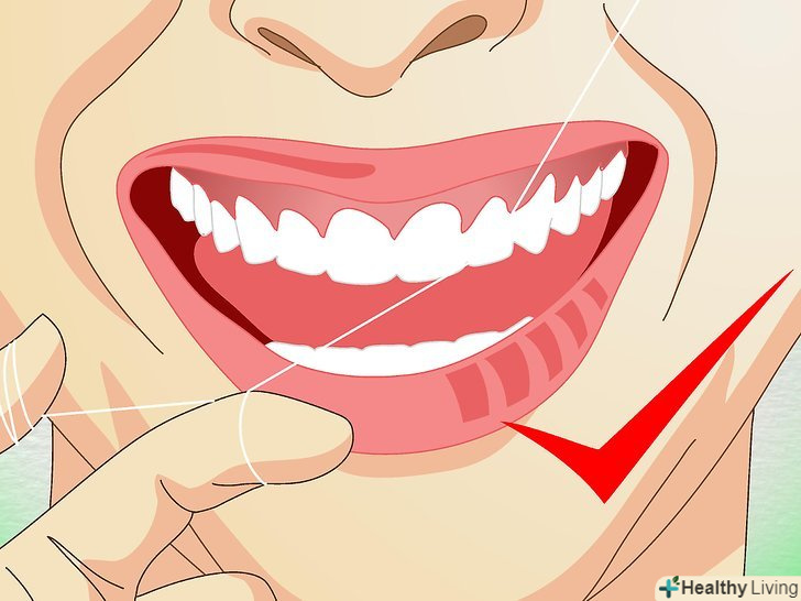 - Користуйтеся флоссом тільки для очищення поверхні зуба над рівнем ясен. Якщо ясна починає кровоточити, прополощіть рот і продовжуйте чистку, але надалі будьте акуратніше.