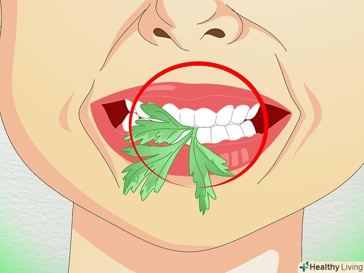 Щоб на час усунути неприємний запах, можна пожувати гілочку свіжої петрушки.Петрушка-зеленолистовое рослина-містить хлорофіл, який природним чином абсорбує неприємний запах в порожнині рота. Щоб швидко освіжити подих, просто пожуйте гілочку або кілька листя петрушки.[6][7]- Свіжий базилік, кардамон, розмарин і зелений чай також мають схожі дезодоруючі властивості.